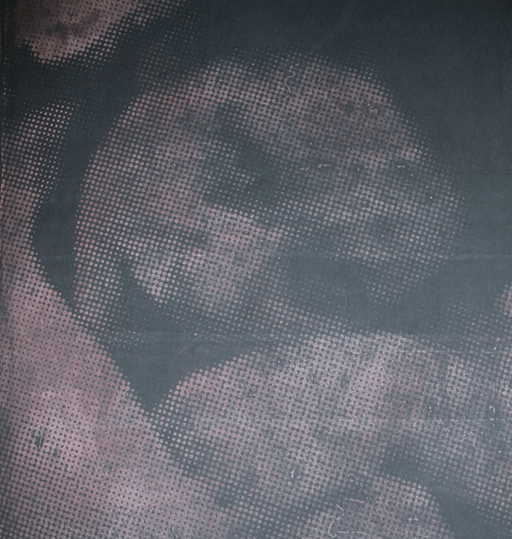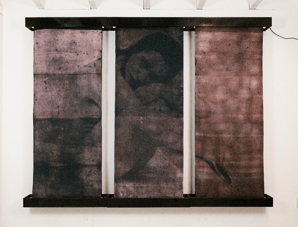 Laura stops talking for a moment and gets up to turn WIB? 3 on. A little motor whirs to life and the three large panels slowly start to scroll in different directions, like tectonic plates shifting gravely in the inky darkness of the deep. Slowly a haunting image begins to emerge across the panels, a body, a face, peering out at the viewer: the ghost of the creator trapped in the pigments. This piece is fraught with tension between the rawness of the chemicals and their symmetrical containment. All of its dark, bruised hues feel like an elemental bleeding through, an eating away of chemicals. It’s destructive, and yet there is this paradoxical creation that emerges from the obliteration of material.