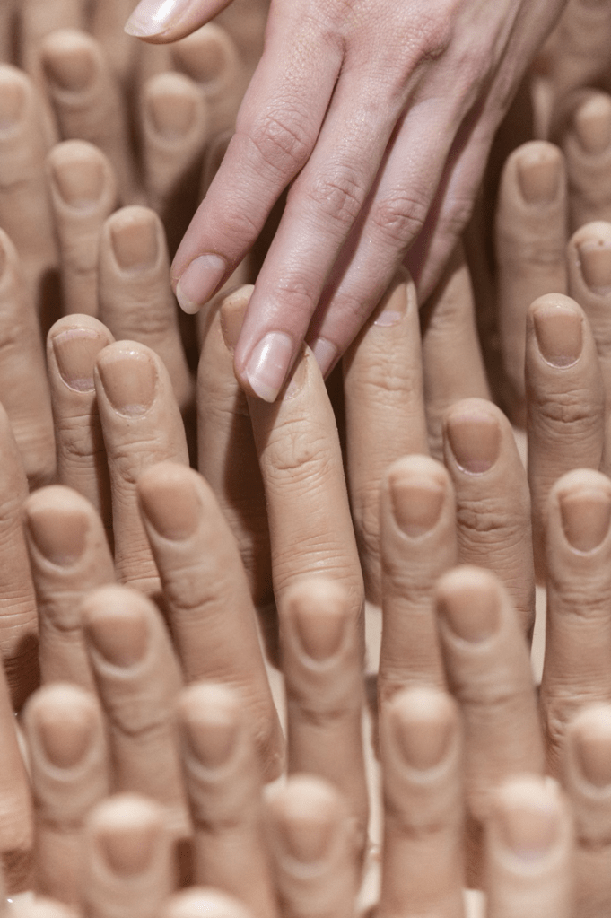The Finger Rub Rug is tactile, highly intimate, and yet at the same time unashamedly open, public and playful. After feeling it, staring at it, being absorbed by its zany weirdness, we return to the lunch table and Laura tells me more about her thinking behind this extraordinary piece and its place in her upcoming solo exhibition: “The rug is made from approximately 1300 replicas of my partner’s fingers. It plays with this shift from the private, personal space, transforming it into a public object.” And isn’t that what art invariably does? It takes intimate, interior energy and drives it forth through one’s fingers, births it into an external object on the page or canvas or marble, an object whose worth and meaning ultimately resides outside of the artist’s control. The Finger Rub Rug turns the focus back on touch, the fingers getting a taste of their own medicine.